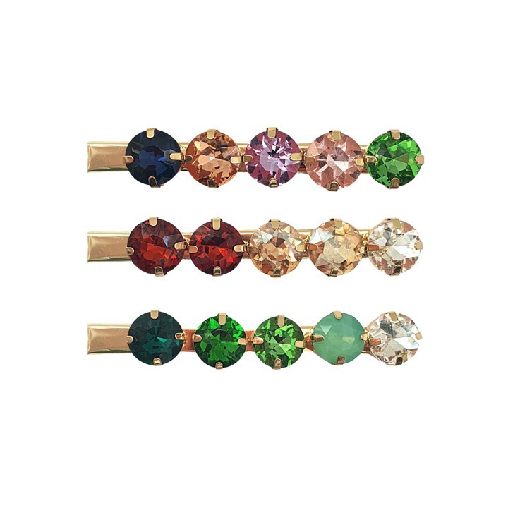 Os acessórios da Coleção Florescer são os queridinhos de muitas clientes! 3 cores de bicos de pato, em cristais de vidro lapidado circulares e a composição inédita das cores é superinteressante! Você pode montar o penteado de várias formas: combinar duas ou três peças para um efeito mais colorido ou montar pares iguais.
